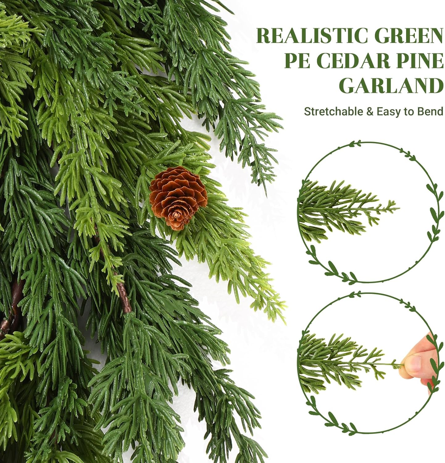 2PCS Christmas Garland, Cedar Garland -Realistic Greenery Cypress Pine Garland with Pinecone for Mantle Table Railing Fireplace Indoor & Outdoor Christmas Decoration