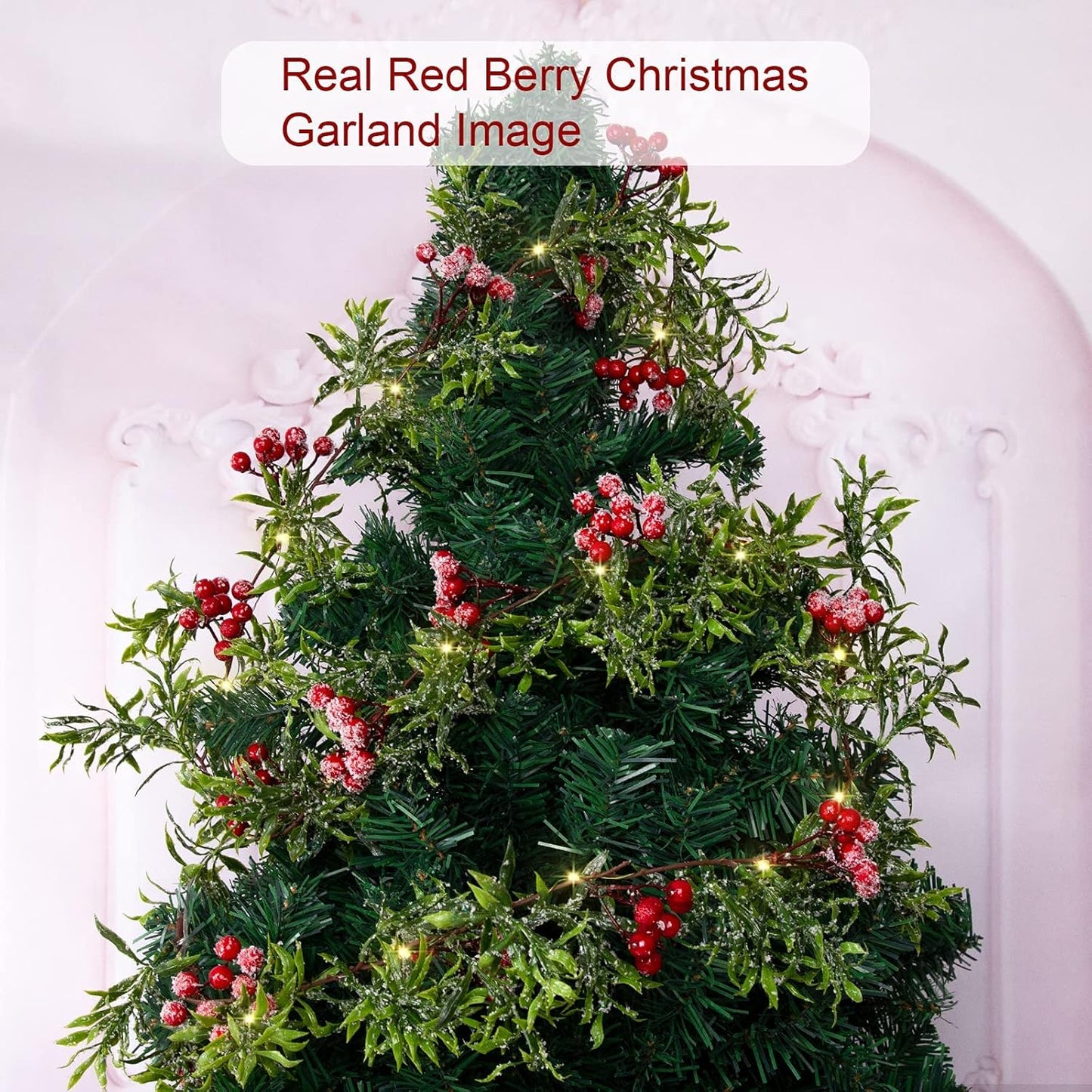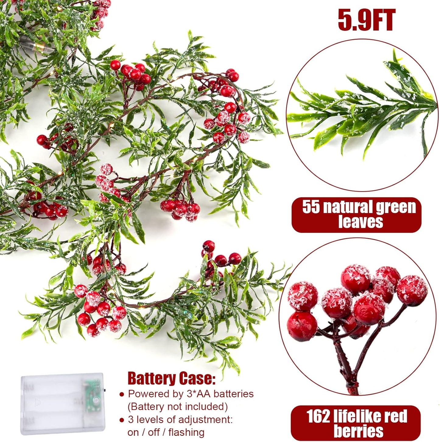 5.9FT Artificial Christmas Garland String Lights with 162 Snowy Red Berries 55 Green Leaves 20 LED Lights Battery Operated for Xmas Mantle Indoor Outdoor Holiday Christmas Thanksgiving Decoration