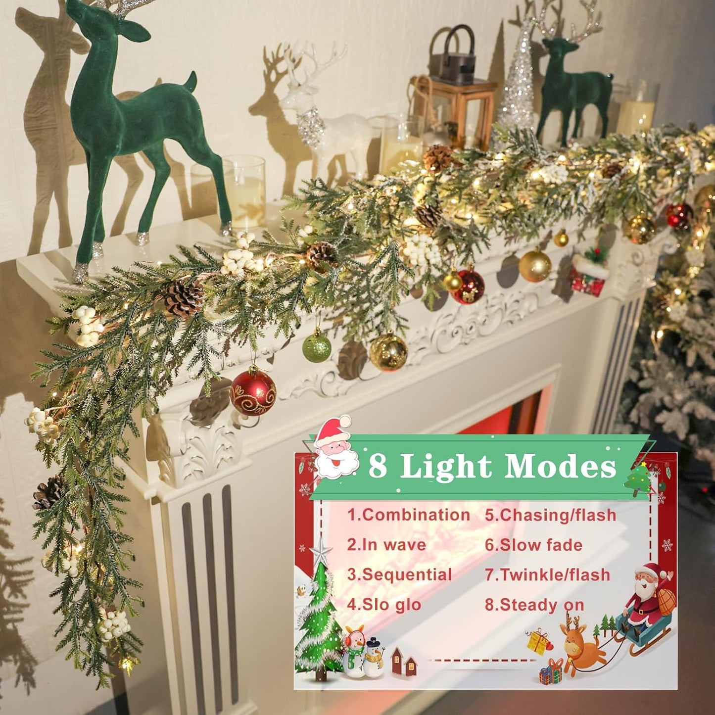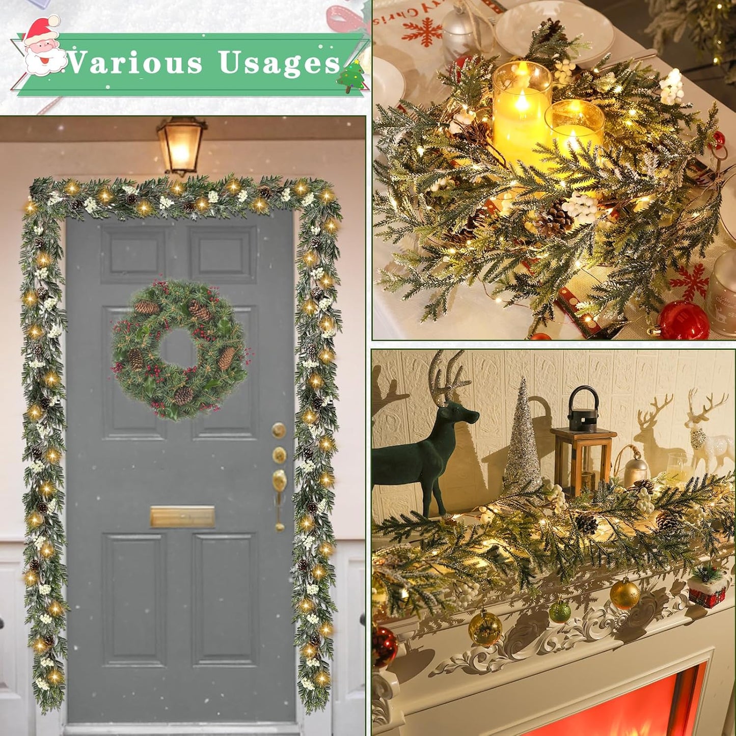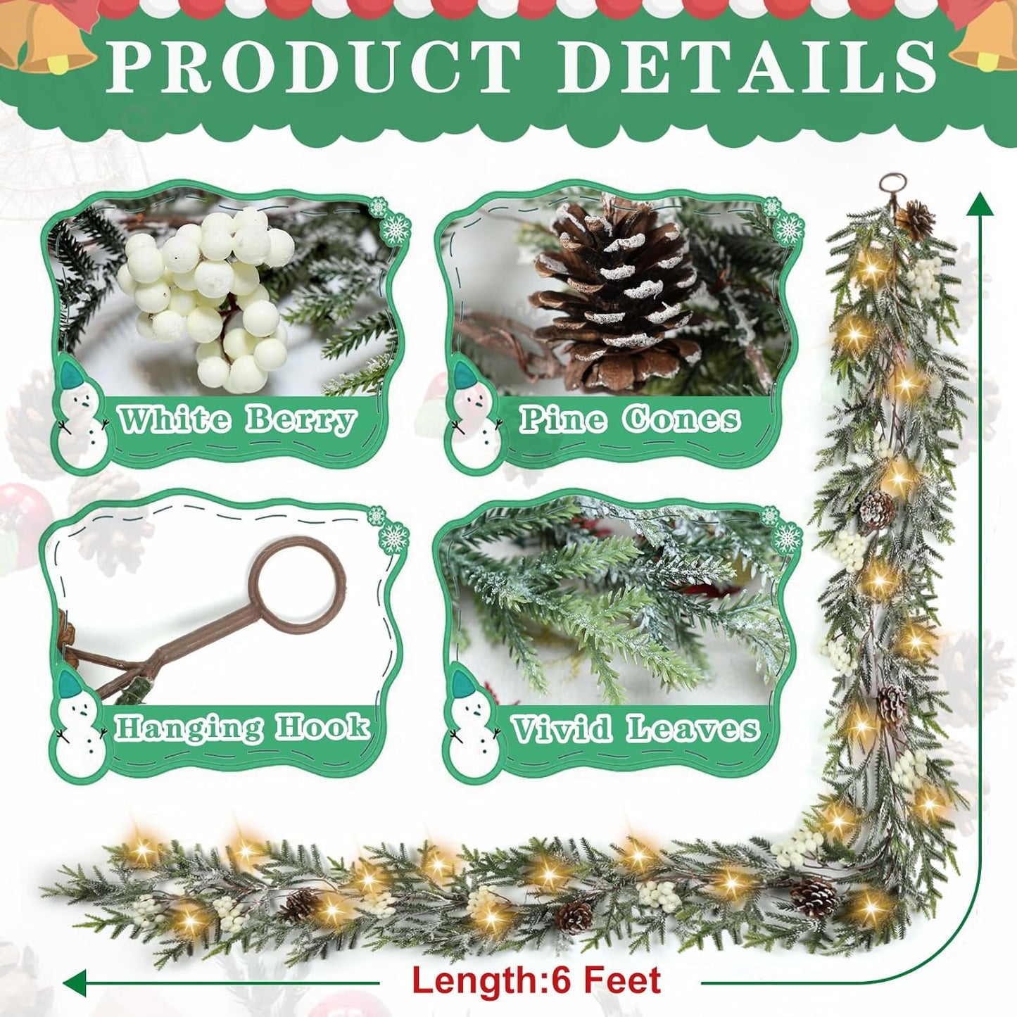6FT Christmas Garland with Lights, Christmas Decorations Indoor Outdoor Pre-lit Artificial Pine Garland with Battery Operated Timer, Home Holiday Decor Flocked Garland for Mantel Window Stairs Wall
