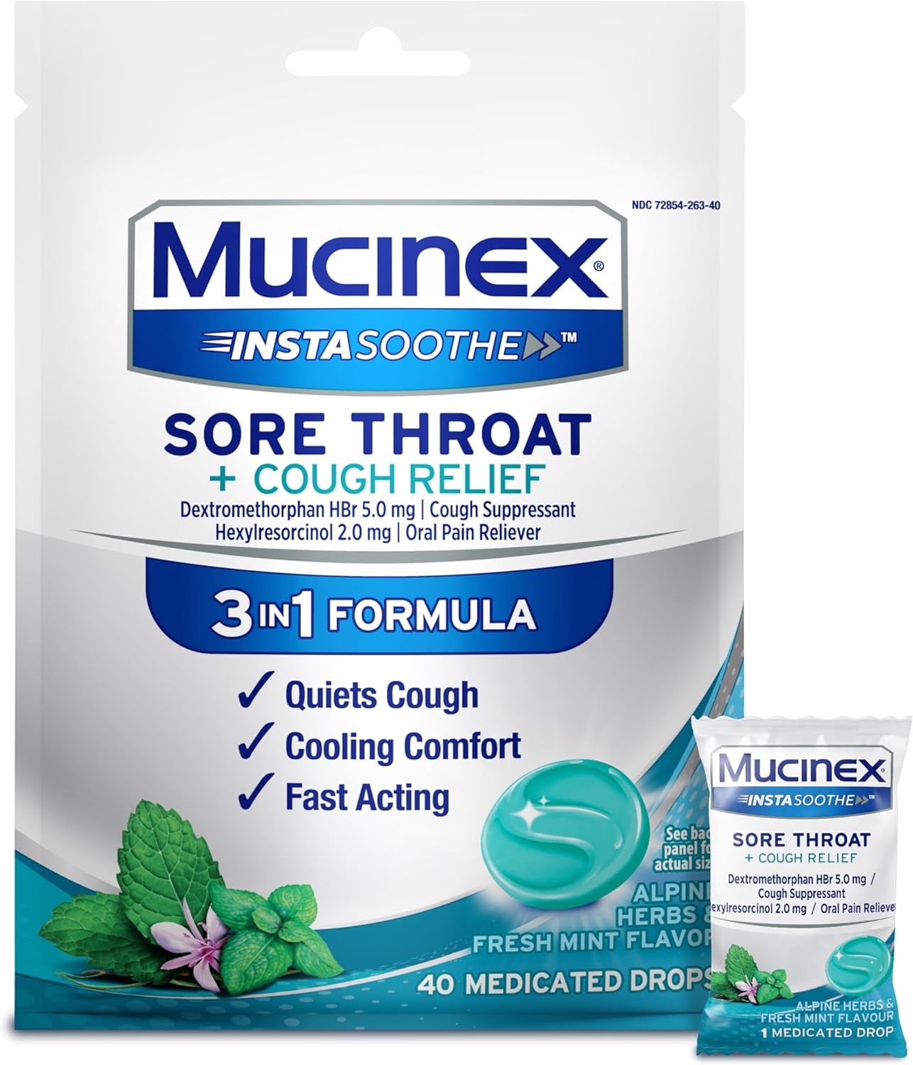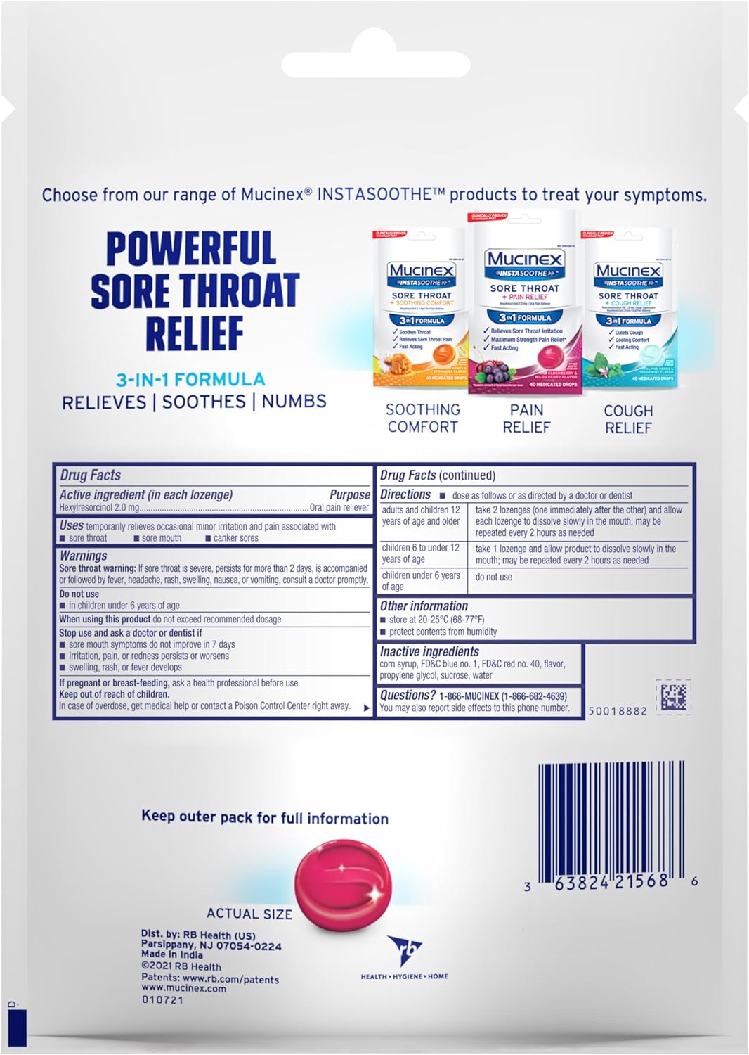 Mucinex Instasoothe Sore Throat Relief, Sore Throat Lozenges, Sore Throat Medicine with Hexylresorcinol, Cough Drops Alternative, 40 Elderberry & Wild Cherry Medicated Numbing Throat Drops